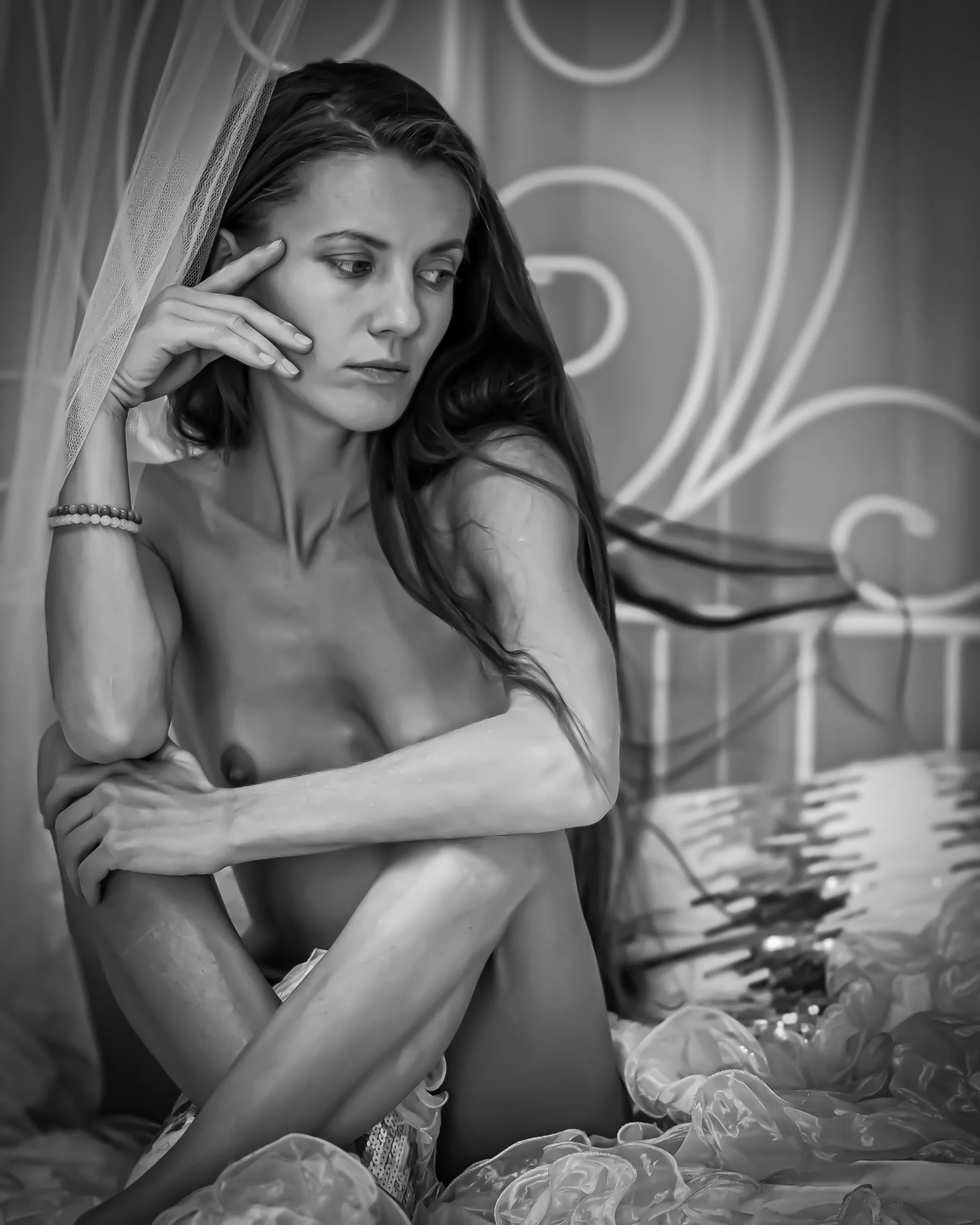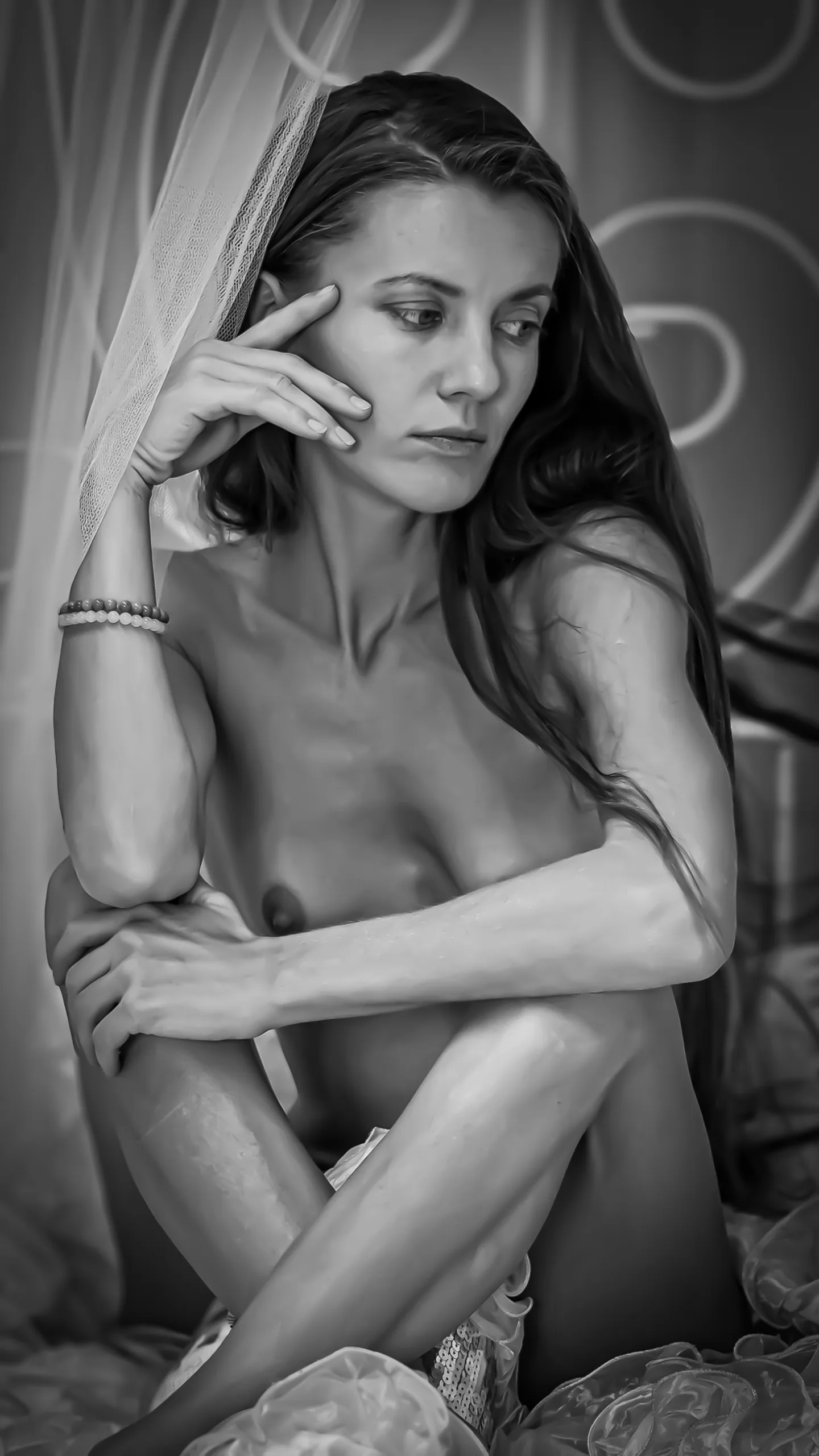 A quiet moment suspended between light and shadow. She sits lost in thought, untouched by time, her gaze turned inward. The softness of the veil and the grayscale tones reveal not just form, but feeling – a glimpse into stillness itself. With this detail it looks a little bit different …